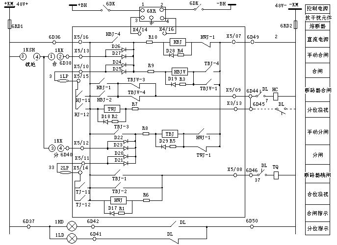 +KM → X5/16 → TBJ-1(TBJ-2)→ X5/08 → TQ線圈 → -KM,從而啟動斷路器跳閘線圈TQ,實現(xiàn)了手動跳閘。