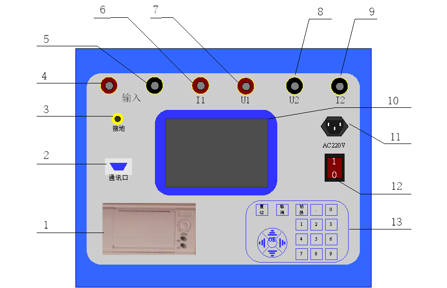 3)安全接地端鈕;                                                       4)5)測試回路的輸入端,接試驗(yàn)調(diào)壓器的輸出端鈕。