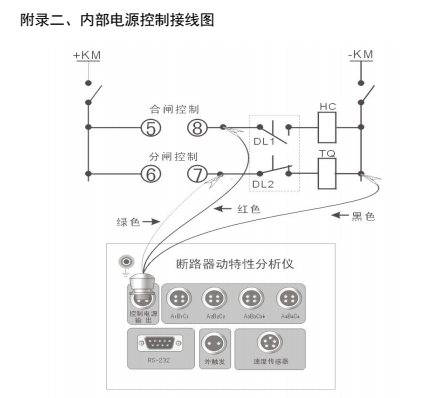 ①分合閘控制電源由儀器內部提供時,斷開被測開關控制箱內的控制電源(通常是將控制箱內控制電源與控制母線相連的保險撥掉),但不能切斷開關機構的儲能電源,然后再按附錄二《內部電源控制接線圖》接線。
