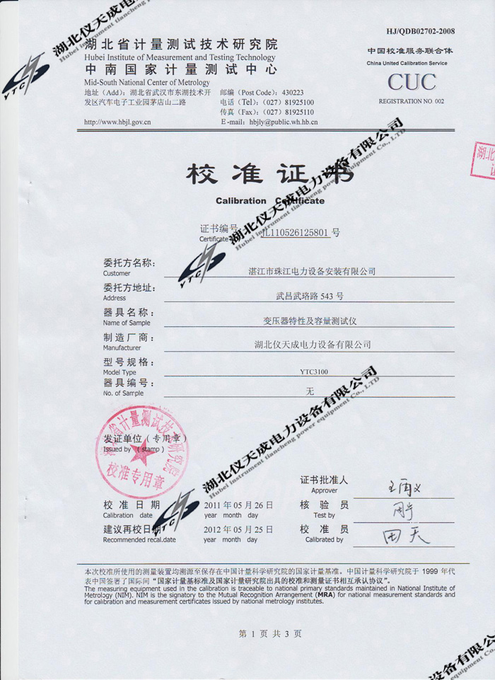 轉(zhuǎn)載:"YTC3100變壓器特性及容量測試儀的資質(zhì)證書" 請(qǐng)注明來源于儀天成電力。 更多技術(shù)問題請(qǐng)致電儀天成電力客戶服務(wù):027-87876585,技術(shù)部專線:027-87876585,在線客服:719388481